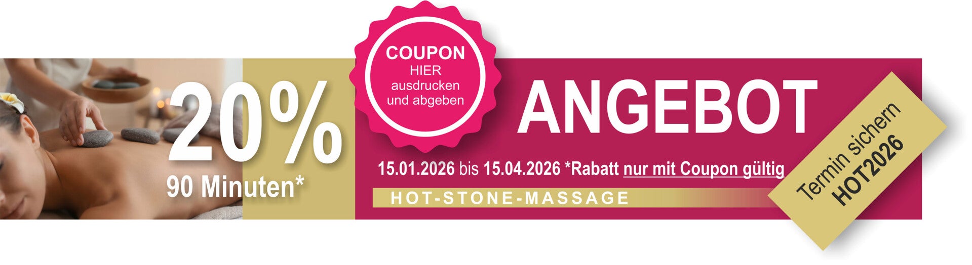 Wir bitten, bei der Hot-Stone-Massage zu beachten, den Termin mindestens 1 Tag vorher zu buchen, da es Vorbereitung benötigt.